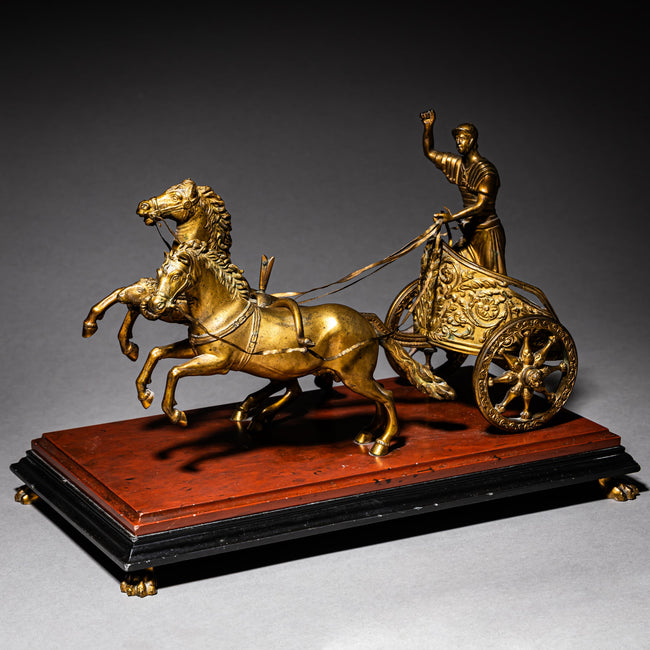 Kleiner Streitwagen aus vergoldeter Bronze mit zwei aufsteigenden Pferden und Wagenlenker in römischer Rüstung. Das Gespann ist auf einem rot-schwarzen Sockel über Löwentatzen montiert.