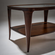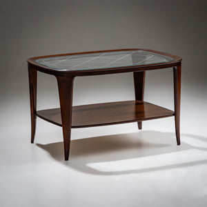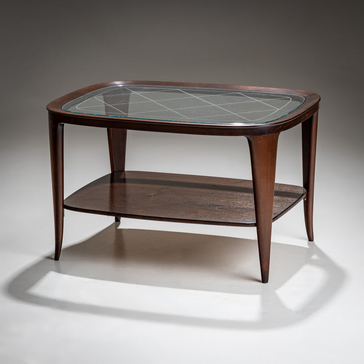 Couchtisch aus Italien mit einer transparenten Glasplatte, die von einem stilvollen Gestell mit abgerundeten Ecken und vier Beinen getragen wird. Das Design vereint klare Linien mit hochwertigen Materialien und spiegelt den Mid-Century-Stil wider. Die Glasplatte ist mit einem dekorativen Rautenmuster geätzt.