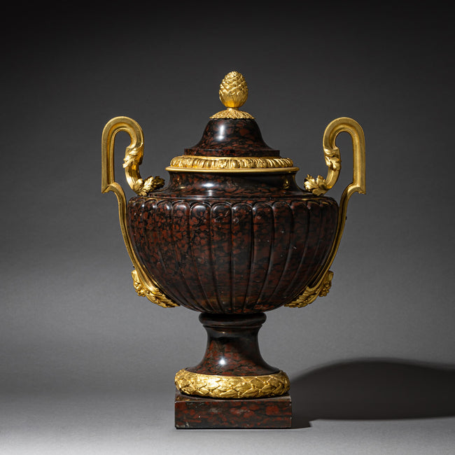 Godronierte Wandung mit Akanthusblattdekor und Pinienzapfen-Nodus, Marbre Griotte und feuervergoldete Bronze.