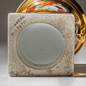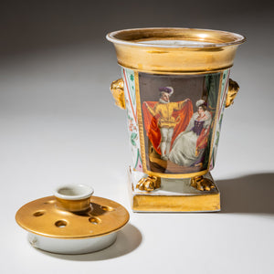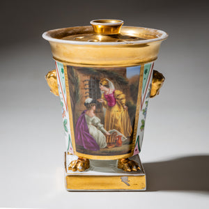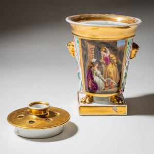 Paar dekorative Potpourri-Töpfe aus Porzellan, verziert mit polychromen galanten Szenen im historistischen Stil. Fein ausgearbeitet und am Boden gemarkt.