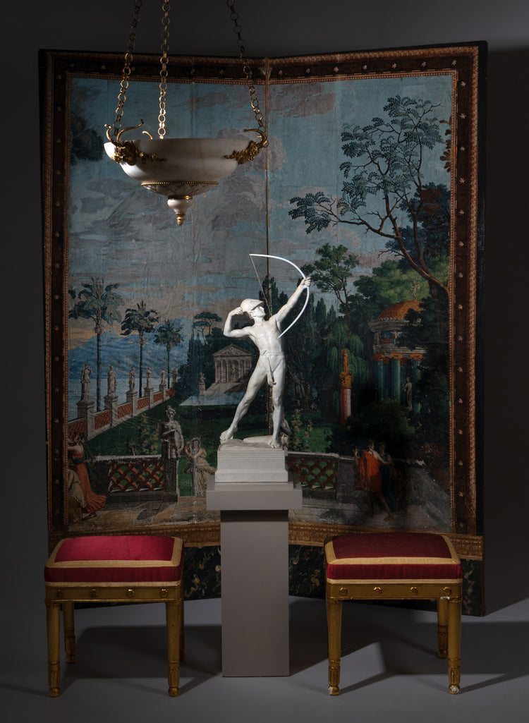 Zwei Bahnen einer Panoramatapete aus dem Sujet Telemach auf der Insel Calypso von Joseph Dufour. Die Tapeten sind auf faltbaren Paneelen aufgezogen und gerahmt. Alters- und Gebrauchsspuren vorhanden.