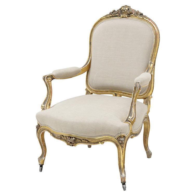 Auf s-Beinen stehender Napoleon III Sessel mit geschweifter Zarge und Armlehnen. Die hohe, abgerundete Rückenlehne sowie Sitz und Armlehnen sind gepolstert. Das golden patinierte Gestell ist mit floralen Schnitzelementen verziert.