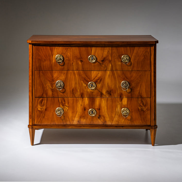 Biedermeier-Kommode aus Kirschholz mit drei Schubladen, ausgestattet mit scheibenförmigen Bronzebeschlägen auf den Schubladenfronten. Die Ecken des Korpus sind abgeschrägt, die Kommode steht auf erneuerten Vierkant-Spitzbeinen. Das Möbel wurde fachgerecht restauriert und von Hand aufpoliert.