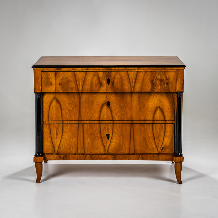 Fränkische Biedermeier Kommode in Kirsche furniert mit drei Schubladen, flankiert von ebonisierten Vollsäulen. Die Schlüsselschilder sind ebenfalls ebonisiert. Die Kommode ruht auf elegant geschwungenen S-Beinen, wurde fachgerecht restauriert und von Hand poliert.