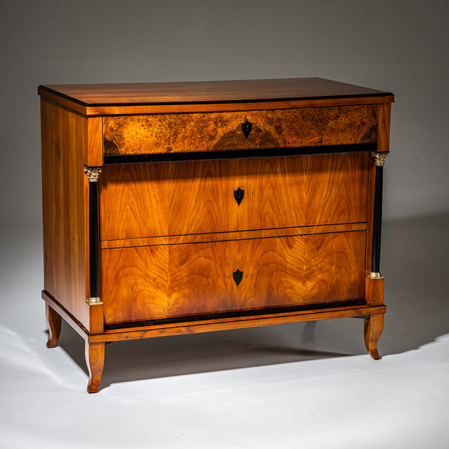 Elegante Biedermeier-Kommode mit drei Schubladen und flankierenden ebonisierten Säulen mit Messingbasen und Kapitellen. Die Kommode ruht auf leicht geschwungenen S-Beinen und ist in Kirschholz furniert. Die oberste Schublade ist kontrastierend in Wurzelmaser ausgeführt. Die Schlüsselschilder sind ebonisiert. Fachmännisch restauriert und von Hand poliert.