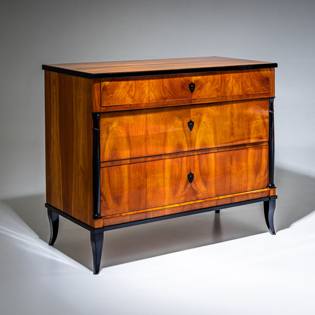Biedermeier-Kommode mit drei Schubladen auf ausgestellten, ebonisierten Vierkant-Spitzbeinen und seitlich angeordneten ebonisierten Halbsäulen. Die oberste Schublade ragt leicht vor und ruht auf den Kapitellen der Halbsäulen. Die Schlüsselschilder sind wappenförmig ausgeführt und ebonisiert. Die Kommode ist in Kirschholz furniert und wurde von Hand poliert.