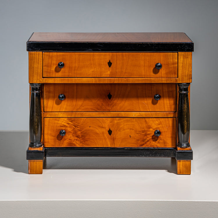 Biedermeier Miniaturkommode in Kirsche mit ebonisierten Säulen und Zierelementen. Die Kommode mit drei Schubladen ist ein charmantes Beispiel für die feine Biedermeier-Schreinerkunst und bietet dem heutigen Nutzer einen dekorativen kleinen Stauraum für persönliche Kostbarkeiten.