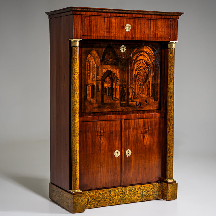 Biedermeier-Sekretär, in Mahagoni furniert mit Thujamaser und grün patinierten Flächen sowie vergoldeten Bronzebeschlägen. Auf der Schreibklappe befindet sich eine in Umdrucktechnik ausgeführte Architekturinterieurszene einer gotischen Kathedrale. Der Korpus wird seitlich von zwei Säulen aus Thujawurzel mit bronzierten Kapitellen und Basen flankiert. Im unteren Bereich ist der Sekretär mit zwei Türen ausgestattet, darüber befindet sich eine Schublade unter einem flachen, profilierten Gesims. Die Inneneinteilung besteht aus sechs kleinen Schubladen in Ahorn mit Tuschmalereien in Form von Ranken und Lyren. Das zentrale Ablagefach ist durch ebonisierte Säulen in Arkadenbögen gegliedert und verspiegelt. Die Seitenflächen zeigen figürliche klassizistische Szenen in Umdrucktechnik. Restaurierter Zustand. Vgl. ein vergleichbares Objekt in München, Bayerische Staatskanzlei (Himmelheber: Biedermeiermöbel, S. 116, Abb. 58).