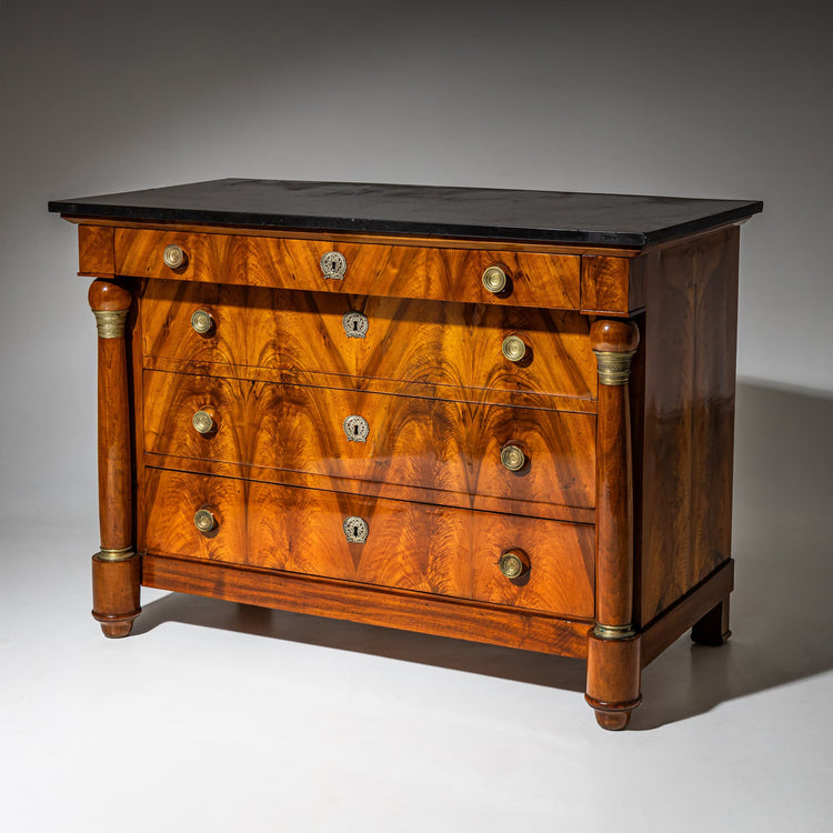 Kommode der Epoche Restauration mit vier Schubladen und geradem Korpus. Die obere Schublade ist flächenbündig ausgeführt, während die darunterliegenden drei Schubladen leicht zurückgesetzt sind. Der Korpus ist in Nussbaum furniert und seitlich von Säulen mit Messingkapitellen und -basen gegliedert. Die Kommode ist mit einer schwarzen Marmorplatte ausgestattet, die kleinere Restaurierungen aufweist. Die Oberfläche ist poliert.
