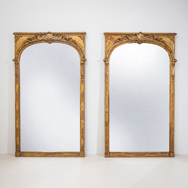 Paar sehr großformatiger Wandspiegel aus Frankreich in reich vergoldeten Holzrahmen mit Muscheldekoren und weiteren vegetabilen Ornamenten. Die Rahmen schließen oben mit einem geraden Gesims ab und fassen die Spiegelflächen in einem sanften, gerundeten Bogen. Die Spiegelgläser sind neueren Datums.