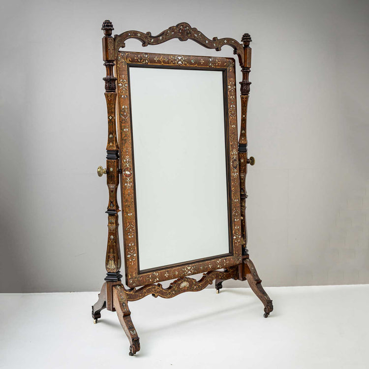 Große Prunkpsyche wohl Franz Xaver Fortner mit Einlagen in Messing, Kupfer, Zinn, Perlmutt und teilkolorierten Lackeinlagen auf Gestell und Spiegelrahmen. Dieser ist drehbar gelagert.