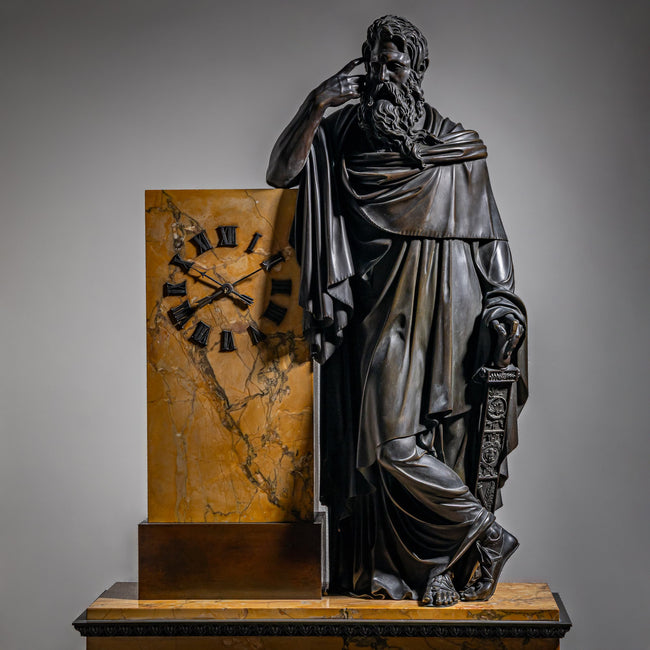 Große Pendule auf Sieneser Marmorsockel mit patiniertem Bronzefries sowie großer vollplastischer Darstellung eines bärtigen Mannes mit Zeigefinger an der Schläfe. Die andere Hand ruht locker auf dem Knauf eines Schwertes. Das Uhrwerk ist bezeichnet „Medaille d’Or, Pons 1827“.