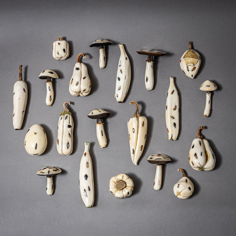 Naturalistisch gestaltete Objekte in Form von Pilzen und Früchten, größtenteils signiert. Gefertigt in Elfenbein in der Shibayama-zaiku-Technik unter Verwendung von Korallen, Perlmutt, Edelsteinen und Metallen. Für jedes Stück liegt eine CITES-Vermarktungsgenehmigung vor.