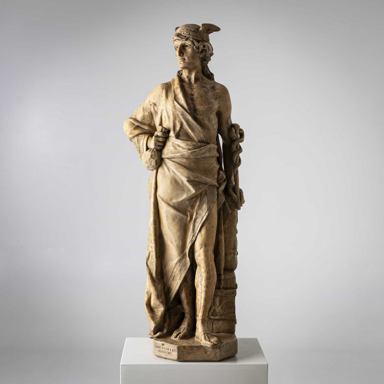 Terrakottafigur des Merkur bzw. Hermes mit langem Mantel und prall gefülltem Geldbeutel in der einen Hand, den Äskulapstab in der anderen. Der stolze Blick und die aufrechte Haltung unterstreichen seine hier hervorgehobene Rolle als Gott der Kaufleute. Auf dem Sockel gestempelt Luis Maciá Barcelona.