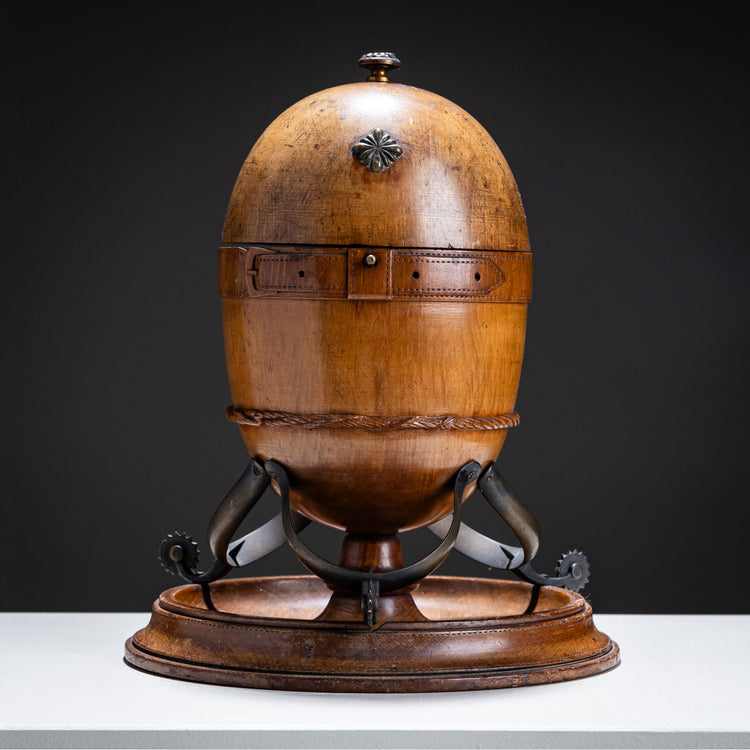 Ei-förmige Holzdose von Maison Alphonse Giroux, Paris 2. Hälfte 19. Jahrhundert auf rundem Standfuß, Metallmontierung und angedeutetem “Gürtel” um die Mitte. Die Dose kann aufgeklappt werden.