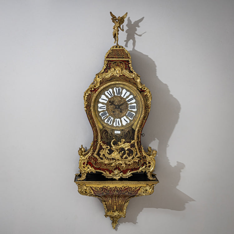 This magnificent Louis XV-style pendulum clock from the mid-19th century features elaborate Boulle marquetry and fire-gilded bronze appliqués in the form of rocaille, shell decorations, peacock motifs, and espagnolettes. The case is crowned by a fully sculpted angel playing a trumpet. The dial comprises twelve enamel cartouches with Roman numerals; at its center is a relief depiction of the Sun King. Below the dial, in another enameled cartouche, is the signature "Crosnier à Paris." Antoine Crosnier was born on January 13, 1732, in Paris. He opened his workshop on Rue Saint-Honoré in 1759 and achieved the title of "maître-horloger" in 1763. Crosnier collaborated with renowned artisans of his time, including bronze casters Robert and Jean-Baptiste Osmond, as well as cabinetmakers Jean-Pierre Latz and Balthazar Lieutaud. Today, his clocks are found in major collections worldwide, such as the Royal Collection in the United Kingdom, the Musée Nissim de Camondo, and Waddesdon Manor.