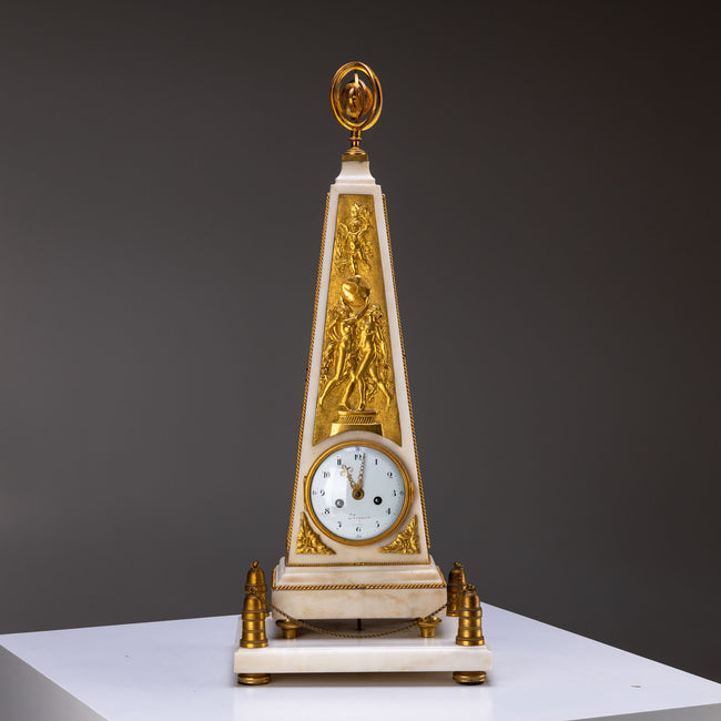 Obelisk-shaped marble clock with fire-gilt bronze appliqués, relief scene, and a surmounting armillary sphere. The clock rests on a white marble plinth with stylized chain railing and low baluster feet, possibly a recent addition. Signed on the dial: “Roque à Paris.” Enamel dial with Arabic numerals.