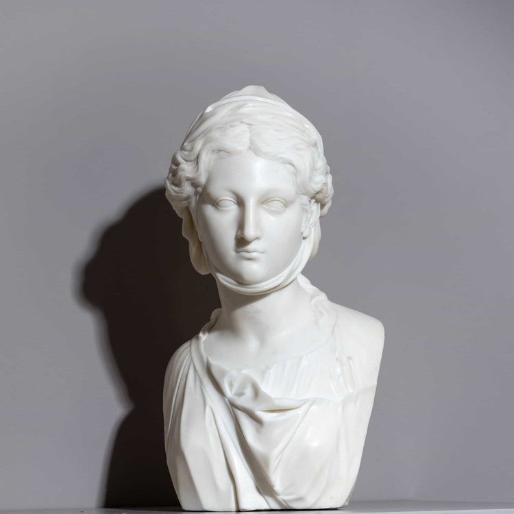 Büste der Zingara bzw. der Wahrsagerin aus Marmor fein herausgearbeitet. Die Zingara ist mit einem um das Kinn geschnürtem Tuch dargestellt, welches sich um die kunstvoll geflochtenen Haare legt und in einer kleinen Spitze mit Punktdekor endet. Sie ist mit einem drapierten Tuch bekleidet und ein Gurt verläuft quer über ihre Schulter. La Zingara oder die Wahrsagerin ist von einer antiken Skulptur inspiriert, welche sich in der Villa Borghese seit dem 17. Jahrhundert befand bis sie von Napoleon in den Louvre verbracht wurde. Nun ist diese “Ägyptische Frau” im Museum von Versailles zu finden. Die Interpretation dieser vollfigurigen Skulptur als Büste wird unterschiedlichen Künstlern zugeschrieben. Sicher ist, dass sich dieser Büstentypus großer Beliebtheit zum ausgehenden 18. Jahrhundert erfreute. Sehr guter, vorsichtig gereinigter Zustand.