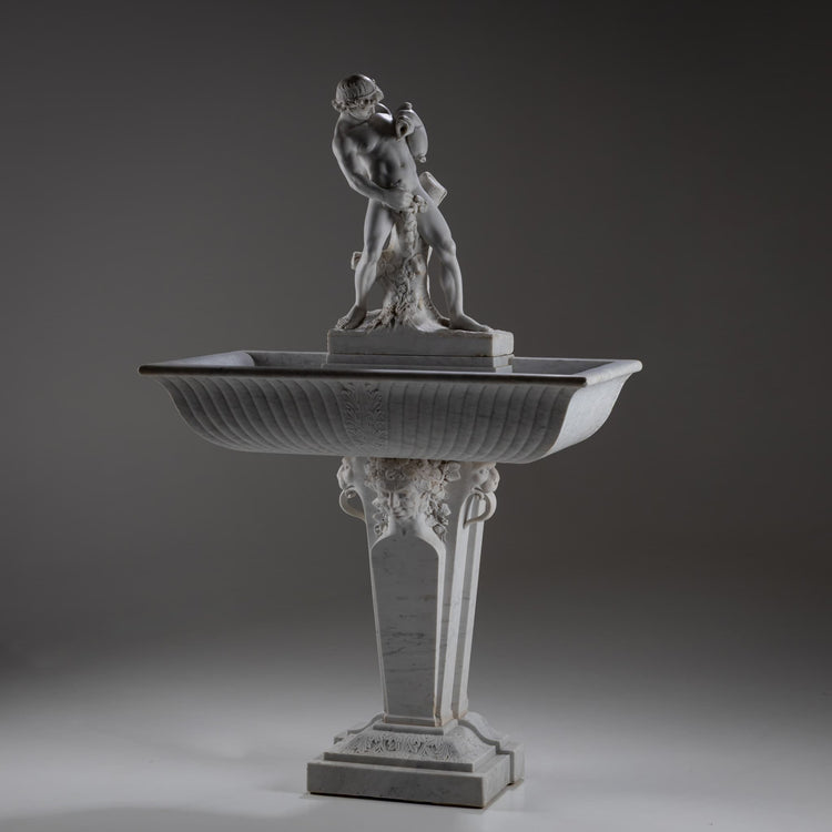 Trapezförmiger Wandbrunnen aus Marmor mit rechteckigem Becken, godronierter Wandung und Blattdekor. Das Becken ruht auf einem Standfuß mit einer Satyrprotome, versehen mit Weinlaub im Haar und flankiert von Löwenmasken mit heraushängenden Zungen. Der abgestufte Sockel ist mit Akanthusblättern verziert. Über dem Becken folgt eine Antikenkopie des Trunkenen Satyrs mit dem Weinschlauch - als vollfigurige detailreiche Ausführung mit Baumstumpf und weiterem Weinlaubdekor.