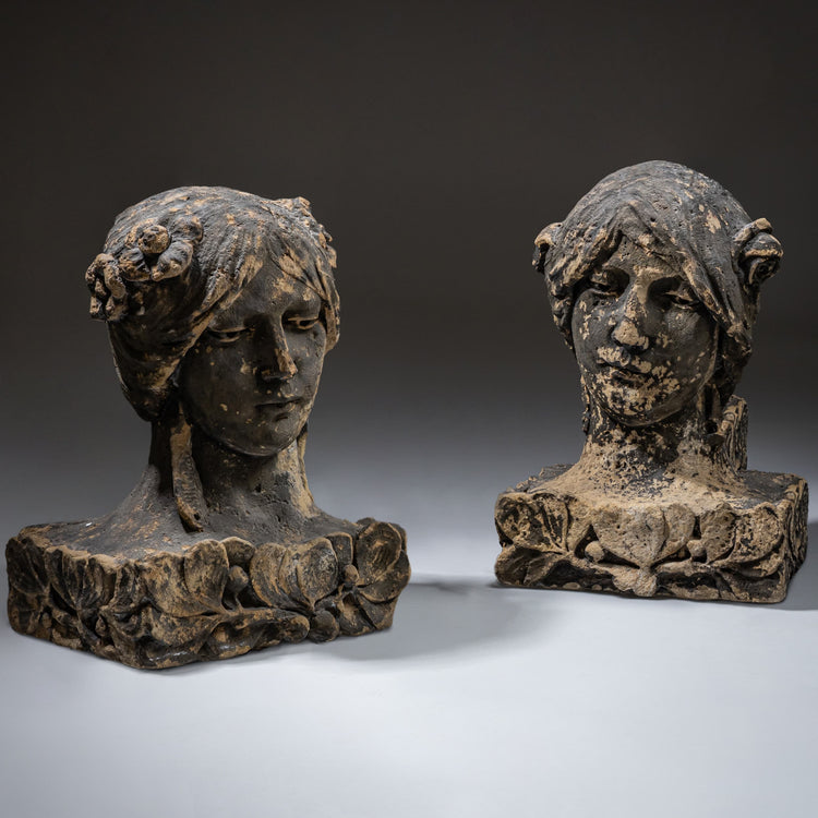 Monumentale Sandsteinbüsten aus der Zeit des Jugendstil in Form stilisierter Frauenköpfe mit Hochsteckfrisuren und floralen Motiven im Haar. Die ausdrucksstarken Köpfe ruhen auf rechteckigen Sockeln, die mit weiteren vegetabilen Dekorelementen verziert sind und den skulpturalen Charakter der Arbeiten unterstreichen. Unrestaurierter Originalzustand mit authentischen Spuren von Verwitterung.