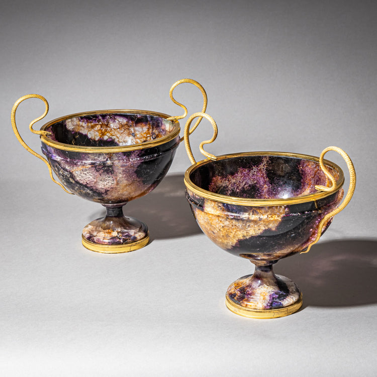 Paar Tazzen aus Blue John auf konischem Standfuß und glatter Wandung, gefasst in feuervergoldeter Bronze. Die Henkel sind in Form von Schlangen gestaltet. Die leuchtende Ausdruckskraft des seltenen Blue-John-Flussspats tritt durch den sorgfältigen Schliff besonders hervor und verleiht den Gefäßen eine zarte Transparenz.