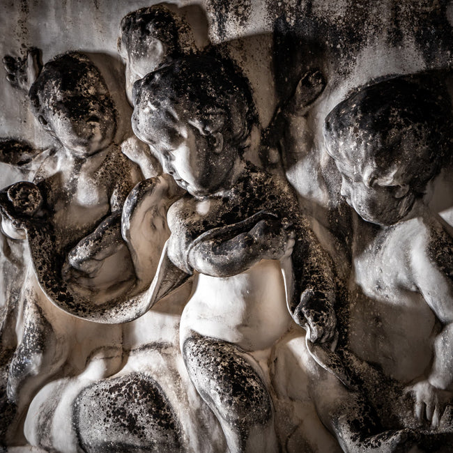 Rechteckiges Relief aus weißem Bisquitporzellan mit Darstellung spielender Putti. Die vier kindlichen Figuren sind in lebhafter Bewegung dargestellt, ein Tuch und eine Schlange verbinden sie in der Komposition. Die Oberfläche zeigt altersbedingte Patina und Verfärbungen, was dem Stück eine besondere Ausstrahlung verleiht.