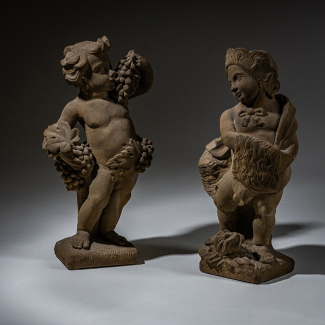 Paar allegorischer Putten aus Sandstein, die die Jahreszeiten Herbst und Winter darstellen. Der Herbst ist durch Weintrauben symbolisiert, während der Winter mit warmer Kleidung und einer kleinen Feuerstelle zu Füßen personifiziert ist.