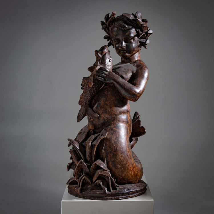 Die Skulptur eines Jungen kniend auf rundem Sockel vor einer Pflanze, einen Fisch haltend. Sein Haupt ziert einen Lorbeerkranz. Auf der Rückseite windet sich der Fischschwanz des Meerjungen. Die Skulptur ist allansichtig gestaltet.