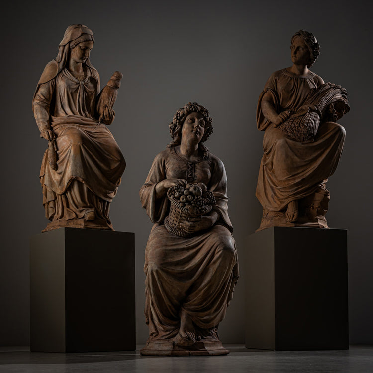 Gruppe von drei Terrakotta-Skulpturen, zwei davon signiert und datiert „Franz Melnitzky, 1855“. Die allegorischen Darstellungen zeigen die Jahreszeiten: Sommer mit Weizenbündel und Sichel, Herbst mit Erntekorb und Winter mit Spindel beim Spinnen. Mit Verwitterungsspuren, kleineren Bestoßungen und stellenweise restauriert. Ein schönes Beispiel österreichischer Bildhauerkunst der Mitte des 19. Jahrhunderts.