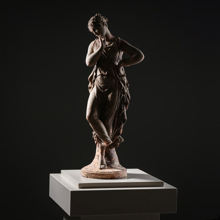 Terrakottafigur nach dem berühmten Modell Danzatrice con dito al mento (1809–1814) von Antonio Canova, dem bedeutendsten Bildhauer des italienischen Klassizismus. Die anmutige Tänzerin ist in eleganter Pose dargestellt, mit erhobenem Arm und dem Finger nachdenklich an das Kinn gelegt – ein Sinnbild klassischer Grazie und Balance. Die Oberfläche zeigt beriebene Patinierung, was dem Stück eine authentische Ausstrahlung verleiht. Am Sockel ritzsigniert: “CANOVA”. Ein Fuß fehlend.