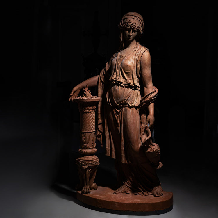 Lebensgroße Terrakotta-Statue einer Vestalin beziehungsweise Tempeldienerin in antikisierender Gewandung, an eine Säule mit Ölflamme stehend. In der linken Hand hält sie eine kunstvoll gestaltete Henkelkanne, mit der sie das heilige Feuer am Brennen hält.