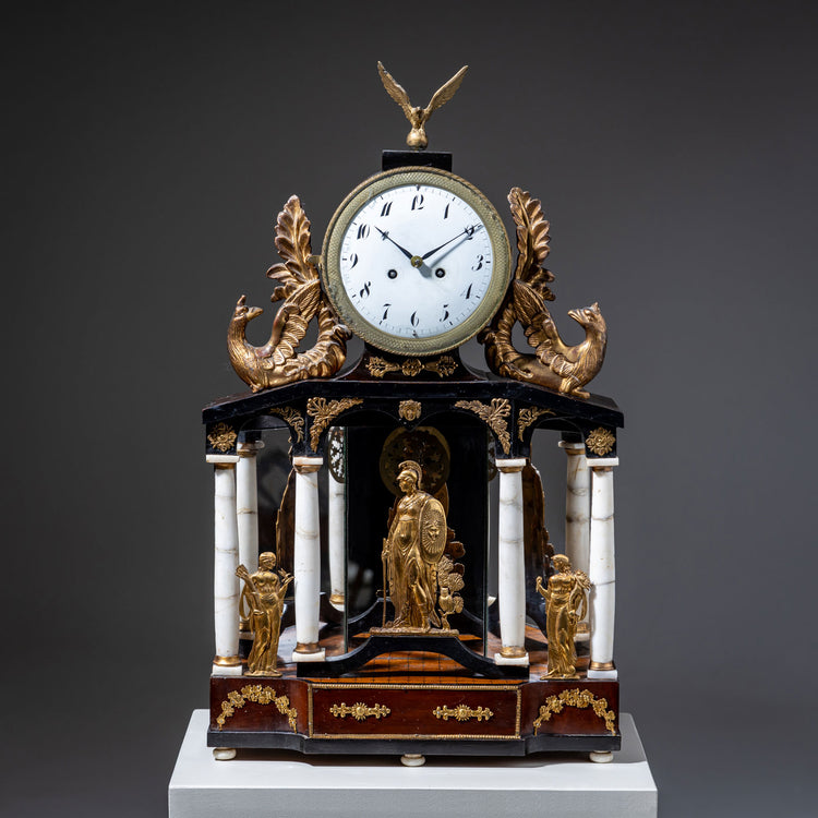 Wiener Portaluhr mit Marmorsäulen und ebonsiertem Gehäuse mit feuervergoldeten Bronzeapplikationen auf rechteckigem Sockel aus Mahaogni. Die Uhr wird von geschnitzten Applikationen in Form von Chimären mit Adlerköpfen flankiert und mit einem weiteren Adler bekrönt. Das Ziffernblatt aus Emaille ist mit arabischen Zahlen versehen und von einem Messingring umgeben. Die Darstellungen innerhalb des Portals zeigen die Göttin Athene mit dem Gorgonenschild sowie zwei weitere Nymphen mit Füllhörnern und Kornähren. Die Uhr befindet sich in einem unrestaurierten Zustand.