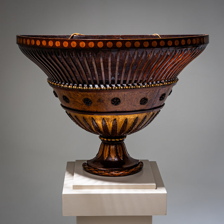 Der furnierte Korb wird am oberen Rand durch kreisförmige Einlegearbeiten kunstvoll abgeschlossen. Der authentische, unrestaurierte Patinazustand unterstreicht den historischen Charme dieses dekorativen Stücks.