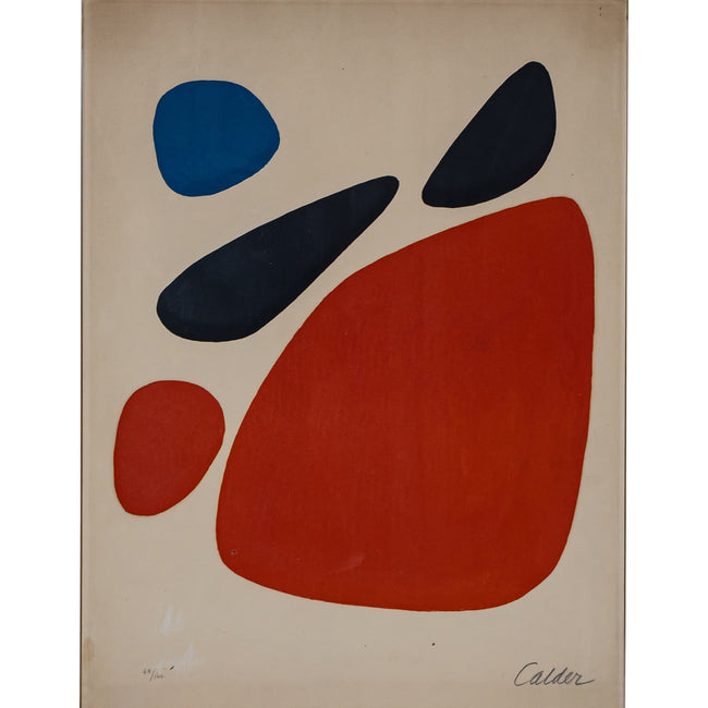 Farblithografie auf Papier von Alexander Calder mit charakteristischen schwarzen, blauen und roten organischen Formen. Das Blatt entstand 1968 als Entwurf für das Plakat des XXIV. Salon de Mai in Paris. Unten rechts in Blei signiert „Calder“, unten links nummeriert „Ed. 48/100“. Gerahmt in einem vergoldeten Stuckrahmen mit Passepartout. Bildmaß: 67 × 51 cm.