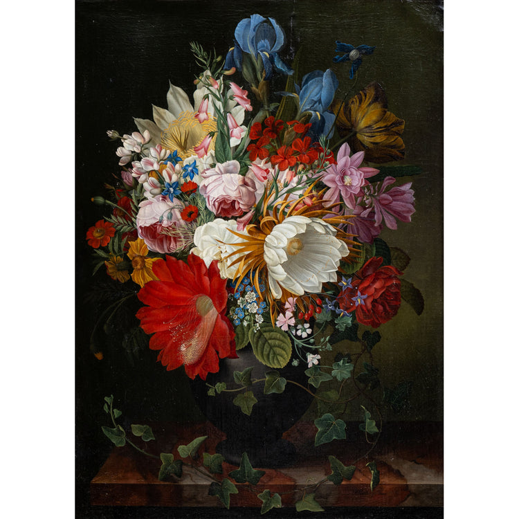 Blumenstillleben in Öl auf Leinwand im Stil der flämischen Meister von Friedrich Wilhelm Voelcker (1799-1870) mit Efeu, Rosen und Schwertlilien.