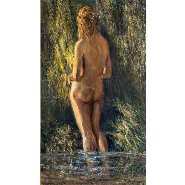 Impressionistisches, hochrechteckiges Gemälde mit der Darstellung eines weiblichen Aktes in Rückenansicht. Die Figur steht bis zu den Waden im Wasser; im Hintergrund ist eine diffuse Waldlandschaft angedeutet. Öl auf Leinwand. Unten rechts signiert „Theo. Guillery“. Gerahmt in einem schwarz patinierten und vergoldeten Profilrahmen.