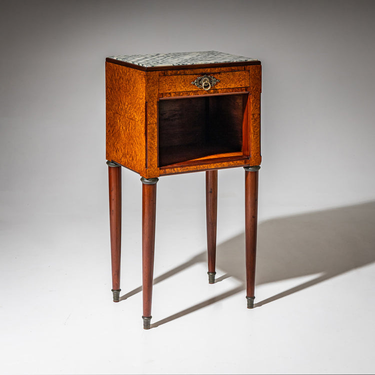 Kleines Nachtkästchen mit Marmorplatte, einem großen Fach und einer kleinen Schublade mit Messingbeschlag. Das Möbel ruht auf konischen Beinen mit Bronzesabots und ist in Thujawurzel furniert.