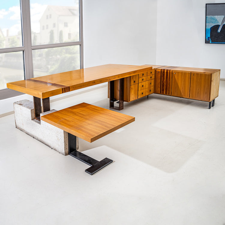 Großformatiger U-förmiger Executive-Schreibtisch mit zwei seitlichen Returns und außergewöhnlicher, asymmetrischer Konstruktion. Ein Standfuß aus Betonguss und Metall verleiht dem Tisch skulpturale Präsenz und architektonische Spannung. Die Tischplatte ist im ansonsten hellen Furnierbild durch ein markantes Streifenmuster in Nussbaumholz akzentuiert. Dieser Hell-Dunkel-Kontrast findet sich auch auf den integrierten Schubladen- und Schrankeinheiten wieder. Neben großzügigem Stauraum besticht der Schreibtisch durch seine visuelle Dynamik – ein ausdrucksstarkes Statement-Piece des italienischen Büromöbeldesigns der 1960er Jahre.