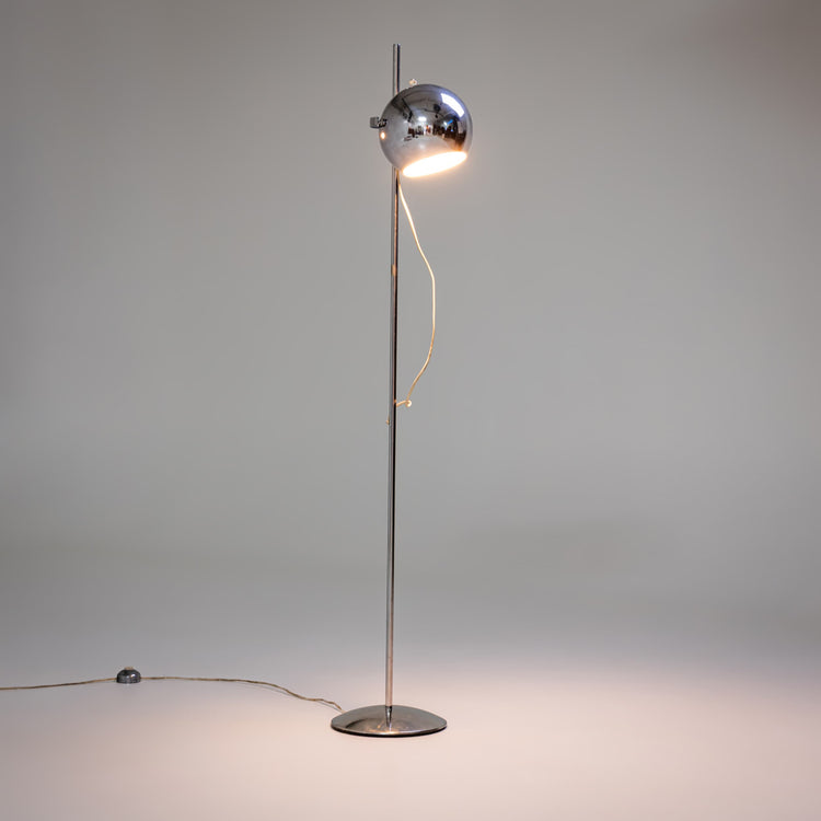 Stehlampe aus verchromtem Metall mit kugelförmigem Lampenschirm an einem schlanken, glatten Stab auf leicht gewölbtem Standfuß. Seitlich etikettiert mit „Reggiani – Made in Italy“.