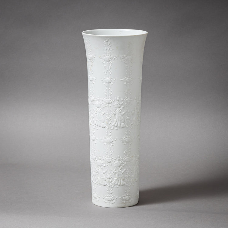 Hohe zylindrische Vase mit leicht ausgestelltem Rand und umlaufender floraler Reliefdarstellung sowie figürlichen Szenen im typischen Stil von Björn Wiinblad. Die feinen plastischen Ornamente zeigen Blumenranken und stilisierte Frauenfiguren mit floralen Attributen. Die Vase besteht aus unglasiertem Bisquitporzellan in Weiß, was die Reliefwirkung besonders betont. Entwurf für die Studio-Linie von Rosenthal, Deutschland. Am Boden mit der grünen Rosenthal-Marke, „Björn Wiinblad“-Signatur sowie dem goldfarbenen Studio-Linie-Stempel versehen.