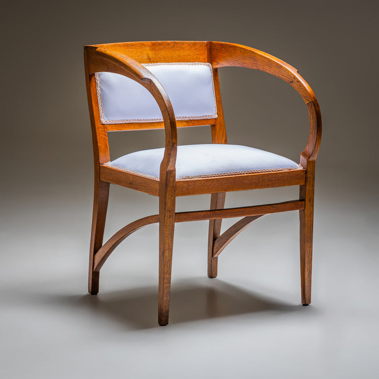 Jugendstil-Armstuhl aus Eiche mit fließend geschwungenen, nach vorn gezogenen Armlehnen. Die leicht ansteigenden Zwischenstreben verleihen dem Stuhl eine ausgewogene, architektonische Struktur. Sitz und Rückenlehne wurden fachgerecht neu mit weißem Stoff bezogen, eingefasst von einer geflochtenen Zierborte.