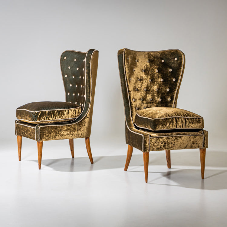 Paar grün-goldene Sessel, dem italienischen Architekten und Designer Gio Ponti zugeschrieben. Die Sessel ruhen auf konischen Vorderbeinen und leicht ausgestellten Hinterbeinen. Die trapezförmig gestalteten Rückenlehnen verleihen den Sesseln eine elegante, architektonische Linie. Sie wurden neu mit einem hochwertigen, changierenden Samtstoff in Grün-Gold mit hellem Keder und Knöpfen bezogen.