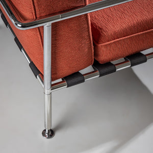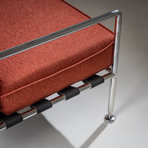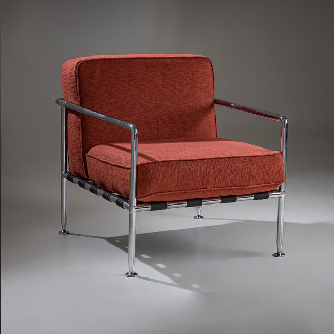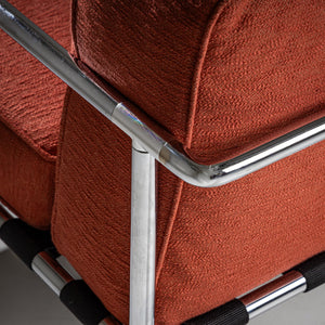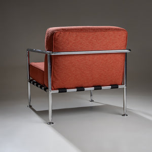 Modernes Sesselpaar mit verchromtem Metallgestell und breiten Gurtbändern als Sitzauflage. Die großzügigen Polster in ziegelrotem Stoffbezug bieten hohen Sitzkomfort und setzen einen kräftigen Farbakzent. Entstanden in der späten zweiten Hälfte des 20. Jahrhunderts.