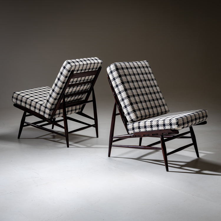 Paar italienische Lounge-Sessel aus den 1950er Jahren, gefertigt auf einem dunkel gebeizten Holzgestell mit konischen Beinen und stabilisierenden Querverstrebungen. Die Sessel wurden neu gepolstert und mit einem hochwertigen, grob gewebten Stoff in schwarz-weißem Karomuster bezogen. Die Kombination aus der klaren Mid-Century-Form und dem markanten Stoff verleiht den Sesseln einen stilvollen, zeitlosen Charakter.