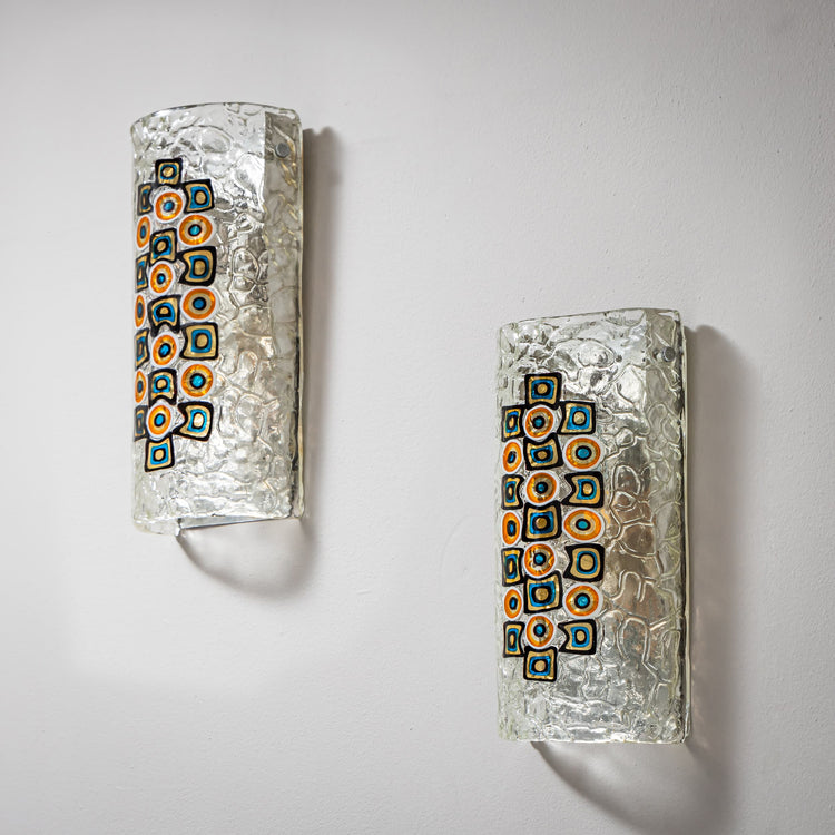 Zwei dekorative Wandlampen aus Muranoglas mit farbigen Einschlüssen und strukturierter Eisglasoberfläche. Die unregelmäßige Glasstruktur erzeugt ein lebendiges Lichtspiel. Rückseitige Wandhalterung aus Metall.