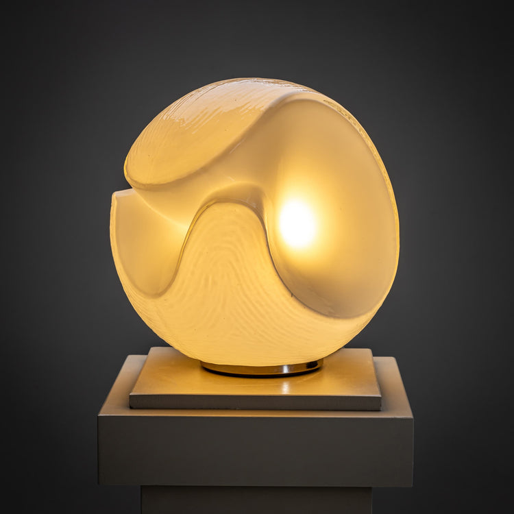 Rundliche Tischlampe, entworfen von Carlo Nason für A.V. Mazzega in den 1970er Jahren. Die Lampe besteht aus weißem Glas mit einer feinen Linienstruktur und organischen konkaven Einbuchtungen, die ihr eine skulpturale und harmonische Form verleihen.