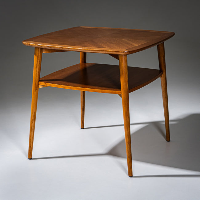 Quadratischer Beistelltisch aus Eschenholz in warmem Farbton mit konischen Beinen. Sowohl die Tischplatte als auch die darunterliegende Ablagefläche sind an den Kanten leicht konvex gebaucht und verleihen dem Möbel eine weiche, plastische Wirkung.
