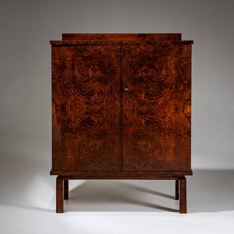 Zweitüriger Art Deco Schrank auf Vierkantbeinen mit einem Podest auf der Oberseite. Der Schrank ist in Nussbaum furniert und wurde von Hand mit Schellack poliert, wodurch die elegante Maserung des Holzes besonders zur Geltung kommt. Im Innenraum befinden sich zwei Regalböden und zwei Schubladen, die großzügigen Stauraum bieten.
