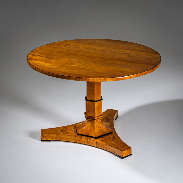 Biedermeier-Salontisch mit runder Tischplatte über einer sechseckigen Mittelsäule mit ebonisierten Details und ausgefächertem Abschluss. Der Tisch ruht auf einem dreipassigen Standfuß. Das Möbel wurde fachgerecht restauriert und von Hand poliert.