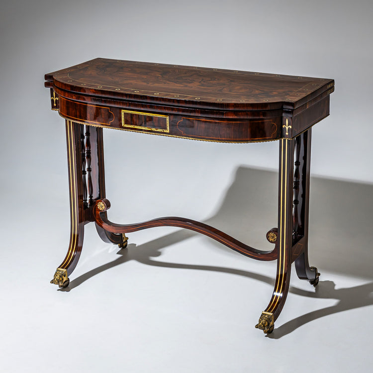 Englischer Spieltisch aus Mahagoni auf Rollen mit Löwenköpfen und Einlagen aus Messing, gedrechselten Stäben zwischen den Beinen und geschweifter Zwischenstrebe. Die Tischplatte ist längsseitig leicht gewölbt, drehbar gelagert und innen mit grünem Filz bezogen. Darunter befindet sich Stauraum. Der Spieltisch wurde handpoliert und aufbereitet. Maße aufgeklappt: 71 x 88 x 86 cm.